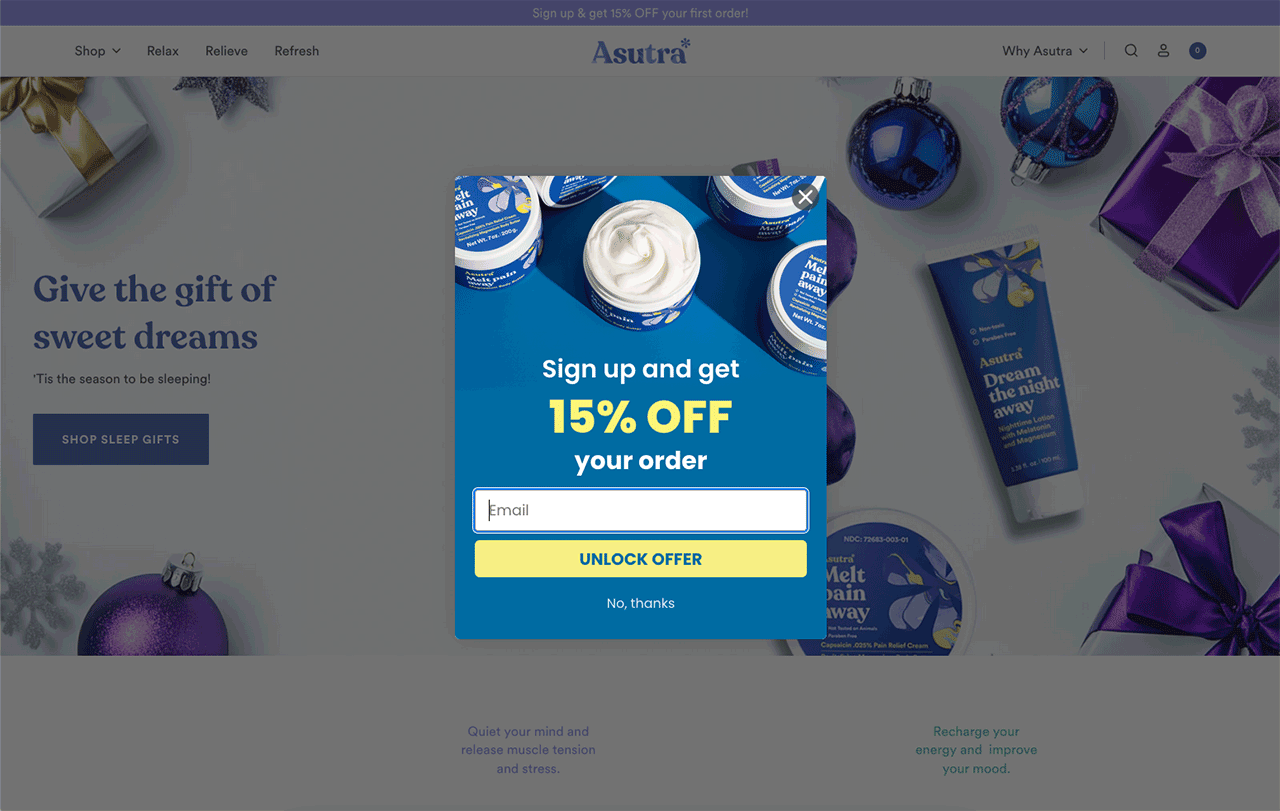 Other elements that we implemented include a new mega menu to help customers easily navigate the site and a pop-up form to collect the customer’s email when they click the banner bar to sign up and get 15% off their first order.