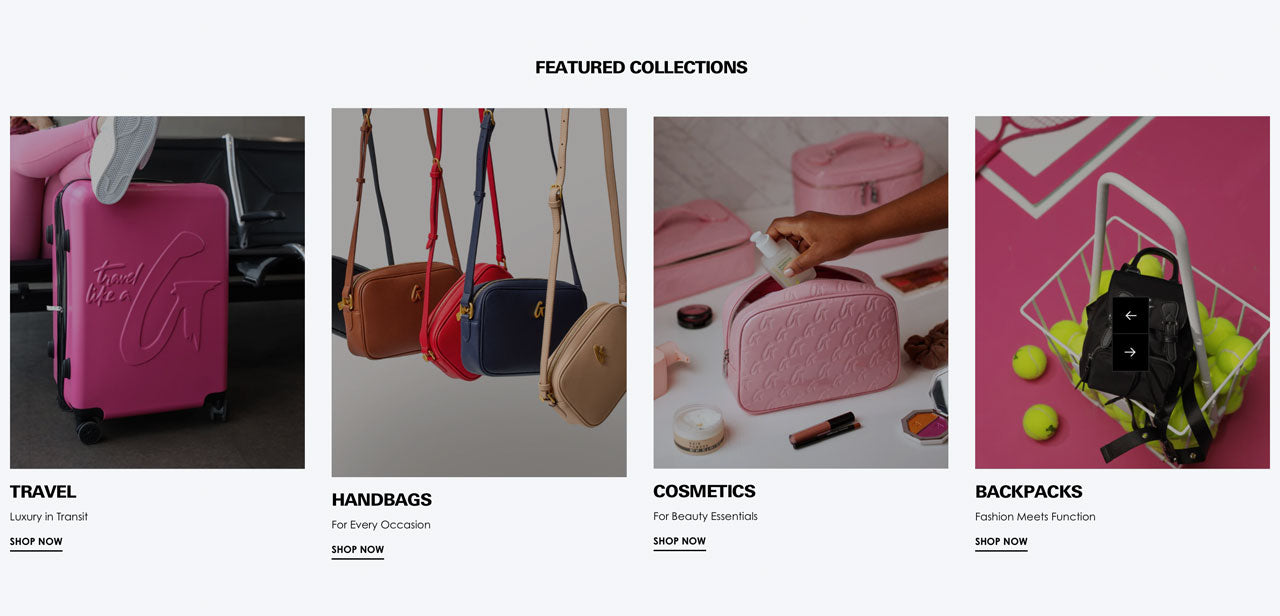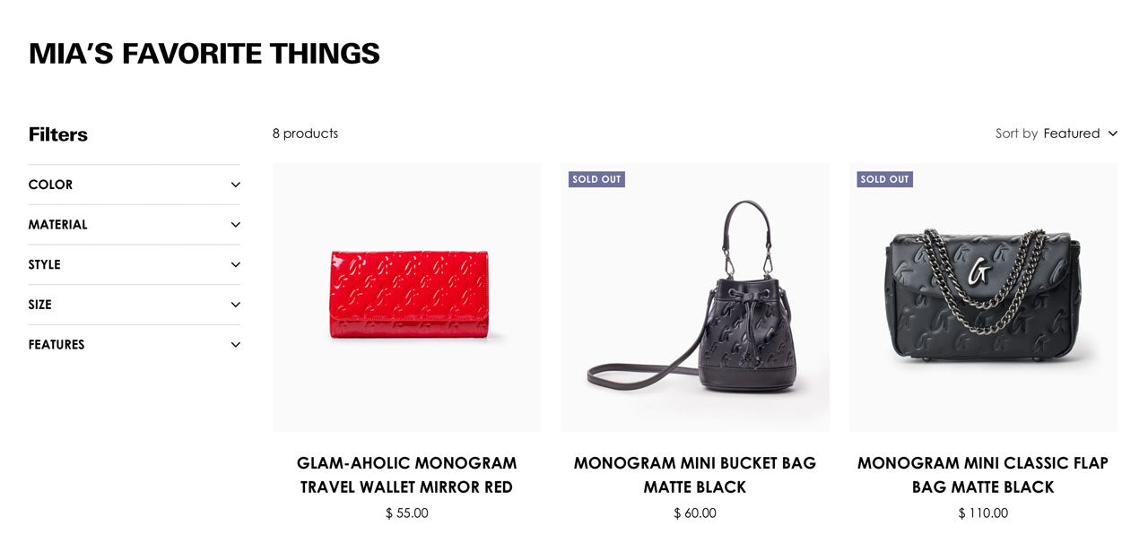 To enhance their e-commerce merchandising strategy, we introduced curated collection categories that go beyond traditional types like “Travel Bags” or “Wallets.” New categories include “Just In” for new arrivals, “Trending” for popular items, and “Mia Ray’s Favorite Things,” which showcases personal picks from the brand owner-ambassador. These categories are designed to boost customer engagement and drive sales by leveraging current shopping trends and influencer endorsements.