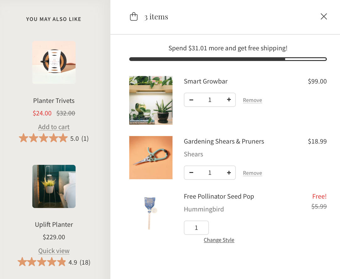 For more upselling opportunities, we implemented a bundle and discounts app, styling and customizing it to integrate it into the rest of the site experience. We also custom coded a progress bar for the cart (which Modern Sprout can customize for different promotions they run) to show how close a customer is to getting a certain discount or free shipping.