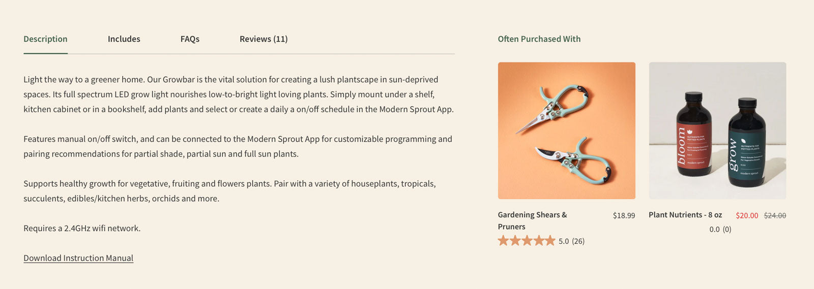 To enable more cross-selling, we implemented Shopify’s Search and Discovery app, available only for Online Store 2.0 themes. It enables Modern Sprout to curate recommendations for complementary products on any product page, in addition to what is automatically generated with Shopify’s recommendation engine.