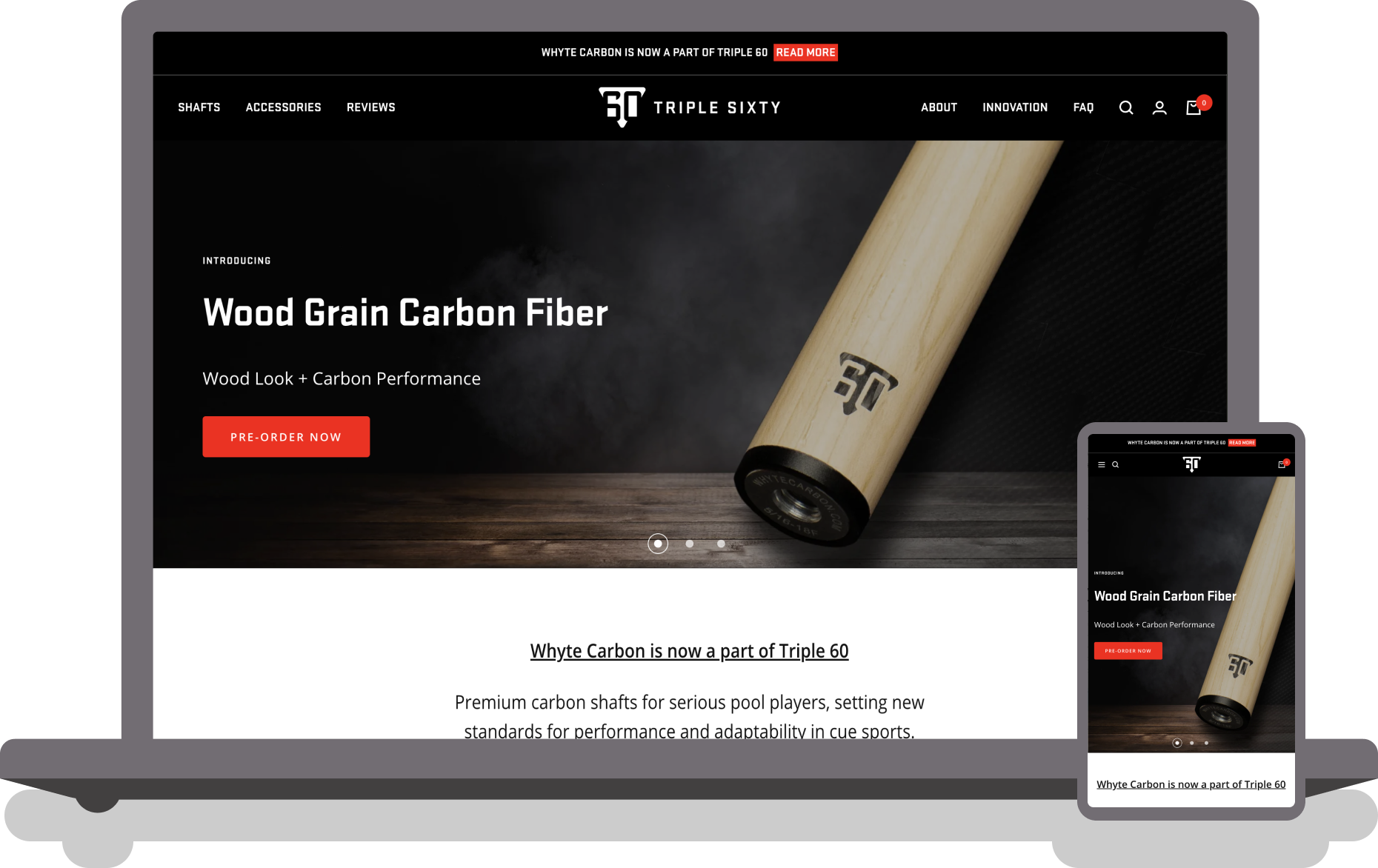 To help ensure a smooth transition with the rebrand, we wanted to make sure the site clearly communicated that Whyte Carbon was now part of the Triple 60 family of products. We added a banner bar at the very top of the site as well as a section on the home page and created an expanded about page, making it clear that people who were looking for Whyte Carbon products were in the right place.