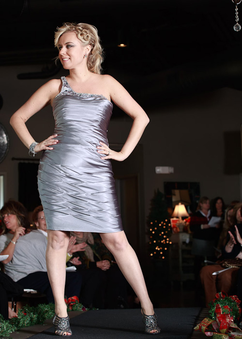 The charity event, which benefited the WINGS battered woman's shelter, was made possible by local businesses donating their services. The models were styled by Indira Salon, and wore apparel from 2 Sisters and New Prospects. Baked by Betsy, All on the Road Catering, and Wine Styles catered drink and food. Amphora hosted the event in their spacious store.