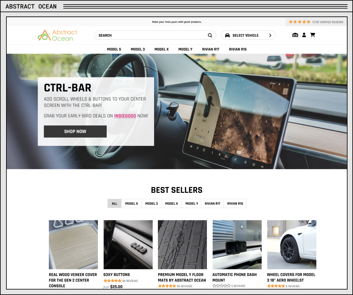 A custom shopify theme for Abstract Ocean to vehicle their Telsa and Rivian vehicle accessories